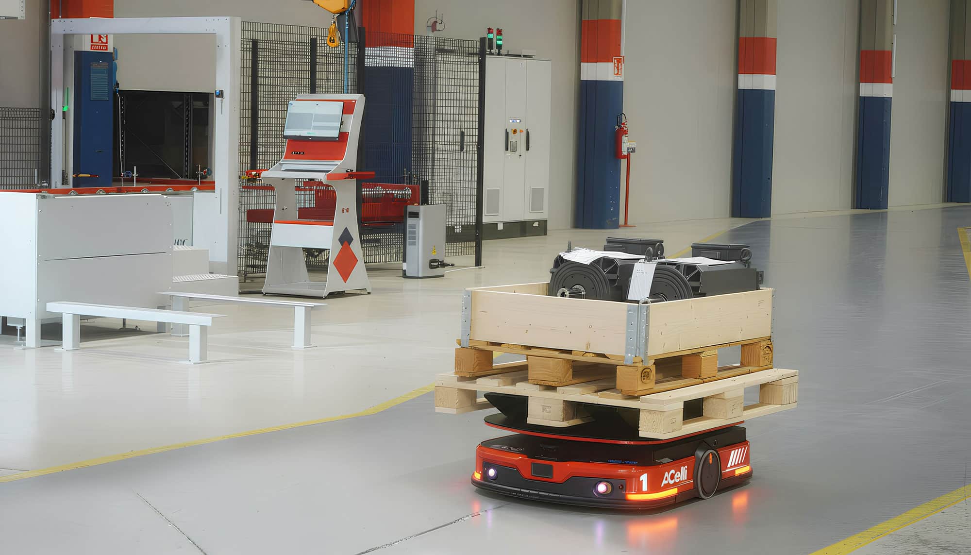 Autonomous robots for transporting raw materials, semi-finished goods and palletised finished products.