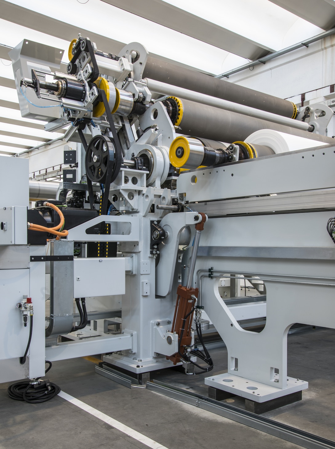 Master roll winder for large-scale spunlaid productions, designed to reduce product waste.