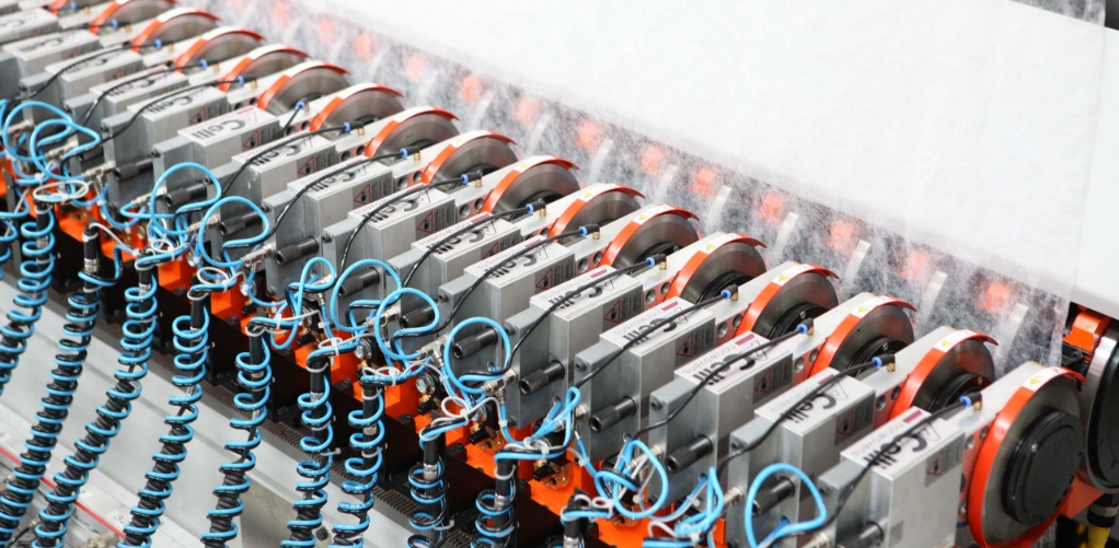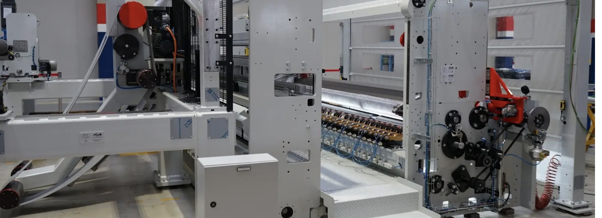 Linea automatica per avvolgimento, ribobinatura e gestione bobine, progettata per consentire l’ispezione del velo e la rimozione dei difetti.
